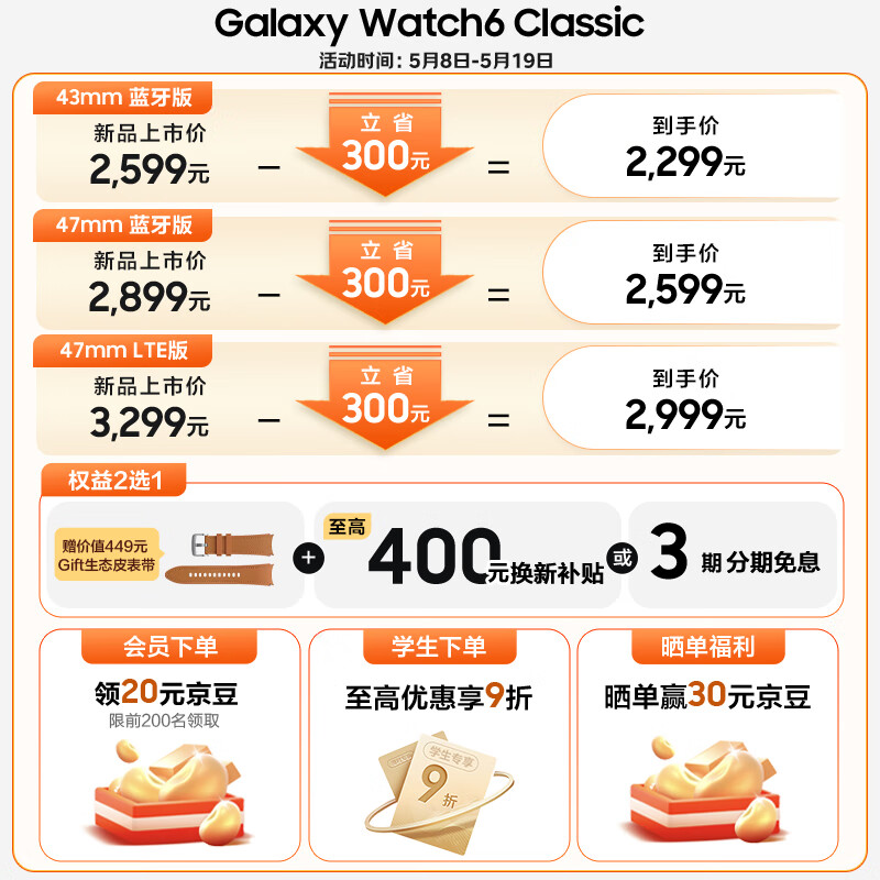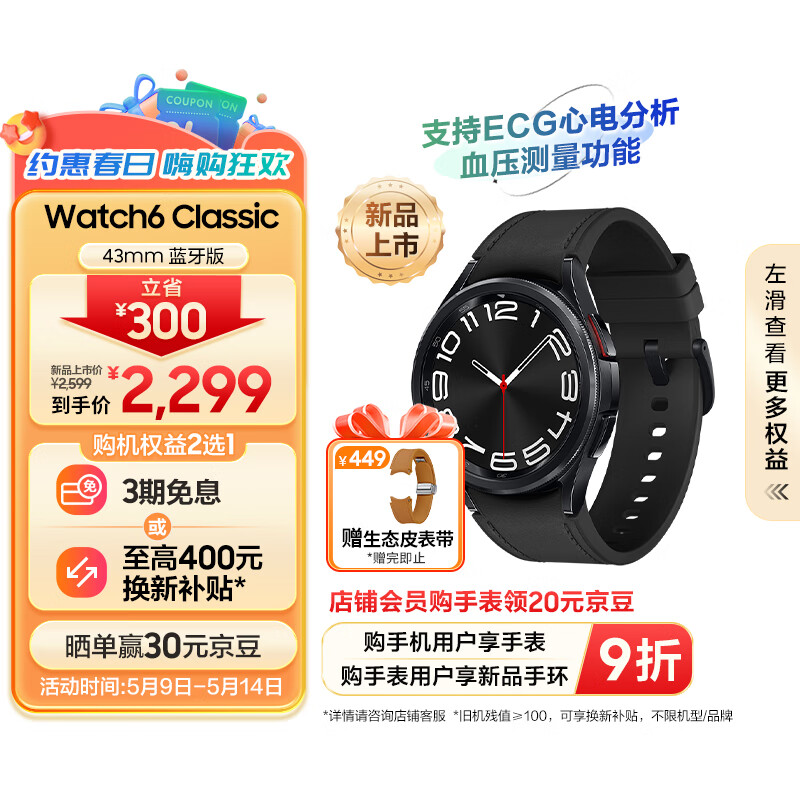 三星Galaxy Watch6 Classic 蓝牙通话/智能手表/运动电话手表/ECG心电分析/血压手表 43mm 宇夜黑价格:2299.00元!