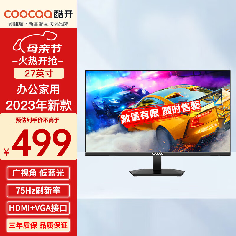 酷开 27英寸 高清办公显示器 75Hz刷新率窄边框可壁挂电脑液晶显示屏家用低蓝光 创维旗下品牌价格:579.00元!