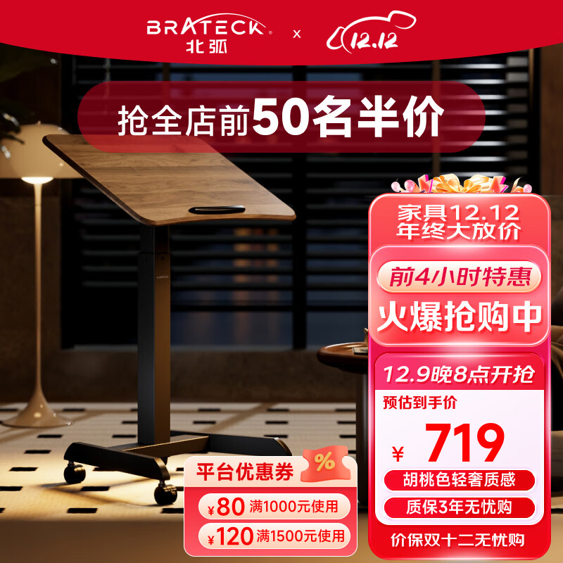 Brateck升降桌 北弧笔记本电脑桌 可移动办公书桌 站立办公升降台K151棕价格:859.00元!