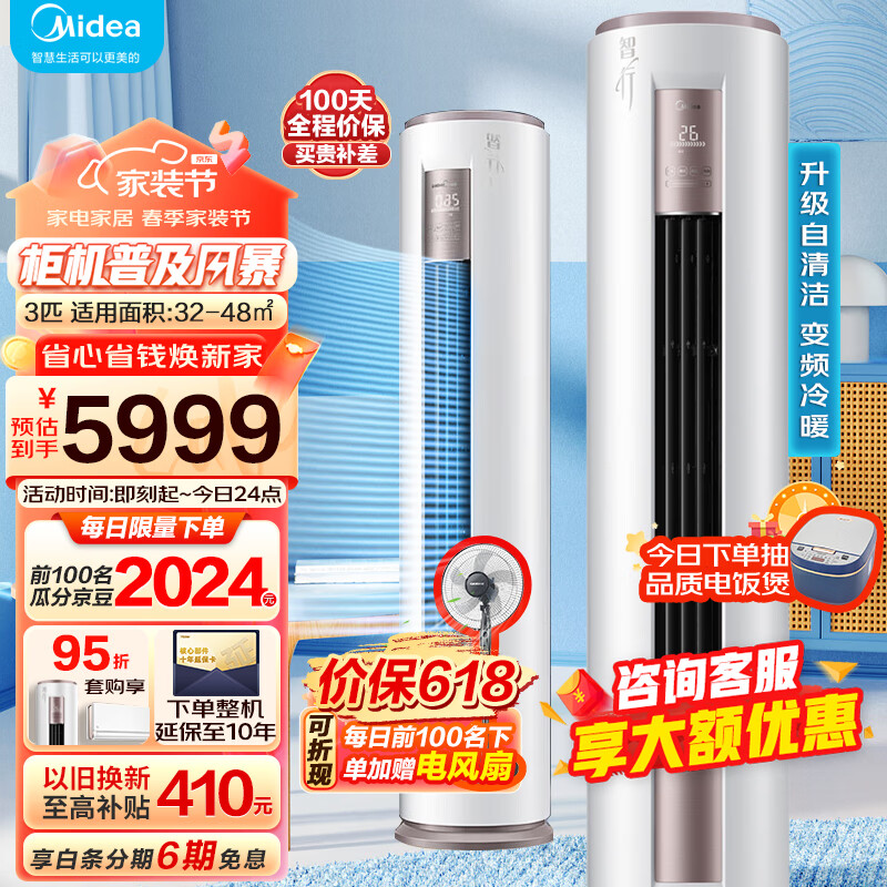 美的(Midea)3匹 智行 新一级能效 变频冷暖 立式空调柜机 智能家电 KFR-72LW/BDN8Y-YH200(1)A价格:5999.00元!