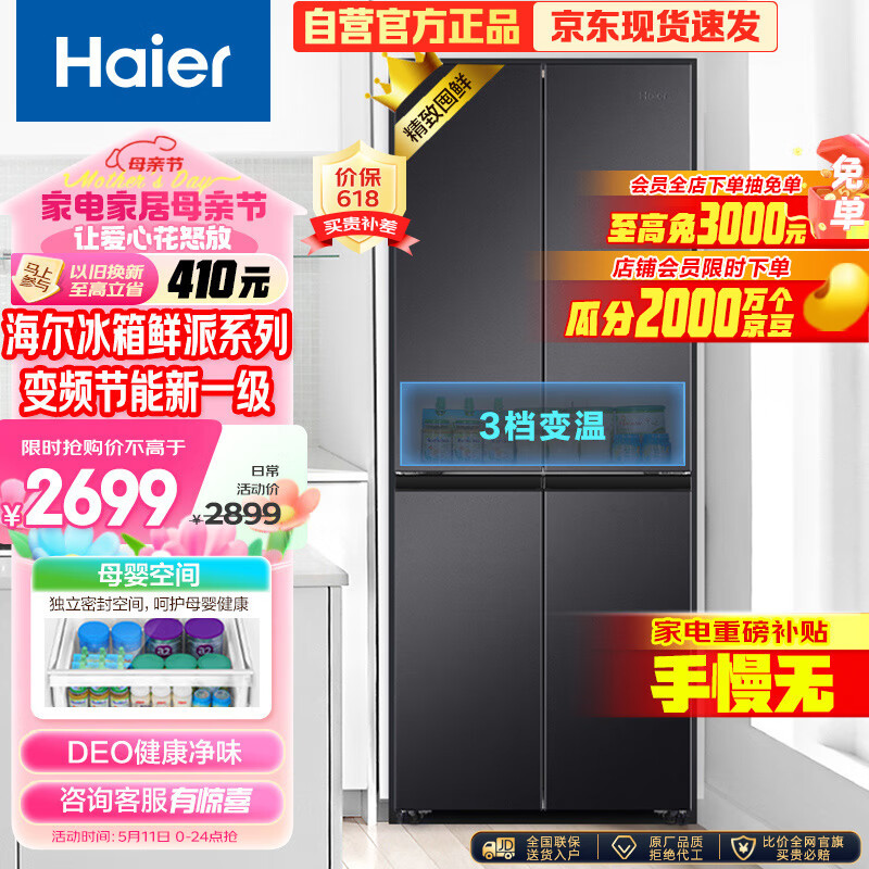 海尔(Haier)鲜派系列401升双变频风冷无霜十字双开对开四开多门超薄家用电冰箱一级能效BCD-401WLHTDEDSDU1价格:2699.00元!