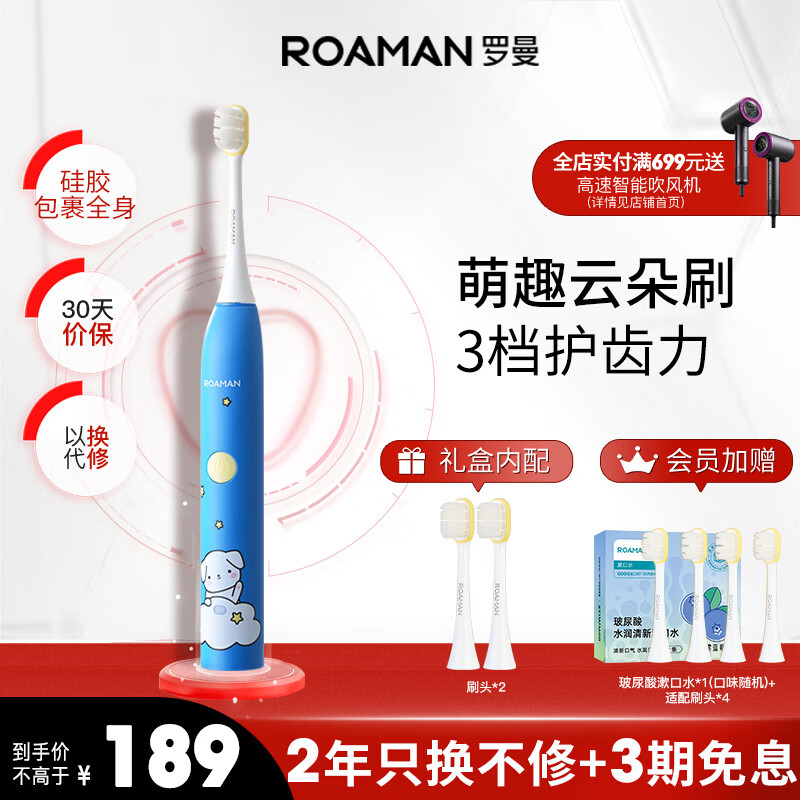 罗曼(ROAMAN)智能儿童电动牙刷 声波震动食品接触级材质充电式乳牙硅胶刷头6-12岁 K8-Z精灵蓝价格:189.00元!