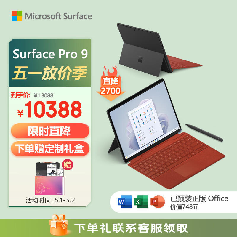 微软Surface Pro 9 石墨灰+波比红带触控笔键盘盖i5 16G+256G二合一平板电脑 13英寸120Hz触控屏办公本价格:10388.00元!