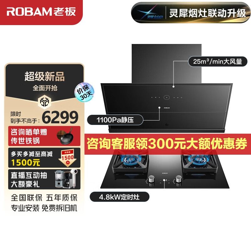 老板(Robam)抽油烟机智能变频灵犀全自动控烟家用侧吸25风量吸烟机燃气灶具烟灶套装29X8S+37B8A(天然气)价格:6299.00元!