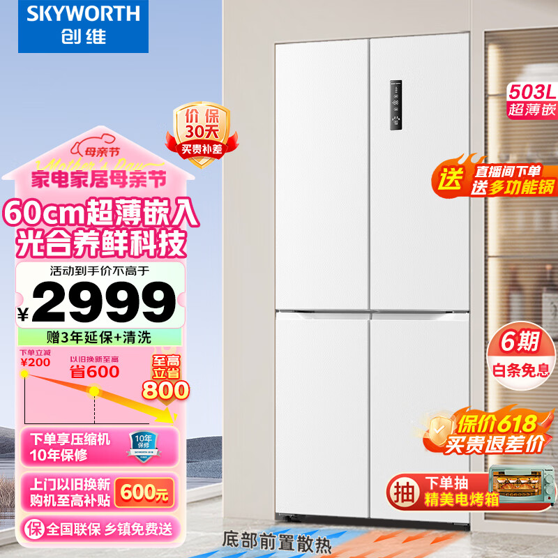 创维零嵌系列503升十字四开门白色冰箱60cm超薄嵌入式大容量家用一级变频底部散热BCD-503W4QB1雪绒白价格:3199.00元!