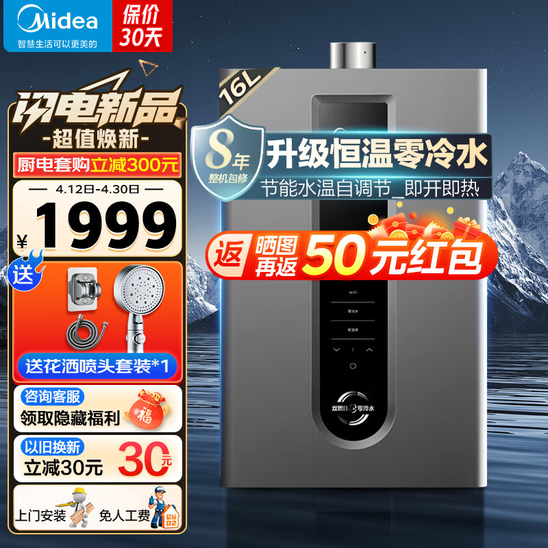 美的(Midea)16升燃气热水器天然气零冷水家用恒温即开即热式强排式智控增压水伺服以旧换新JSQ30-NT1 pro价格:1999.00元!