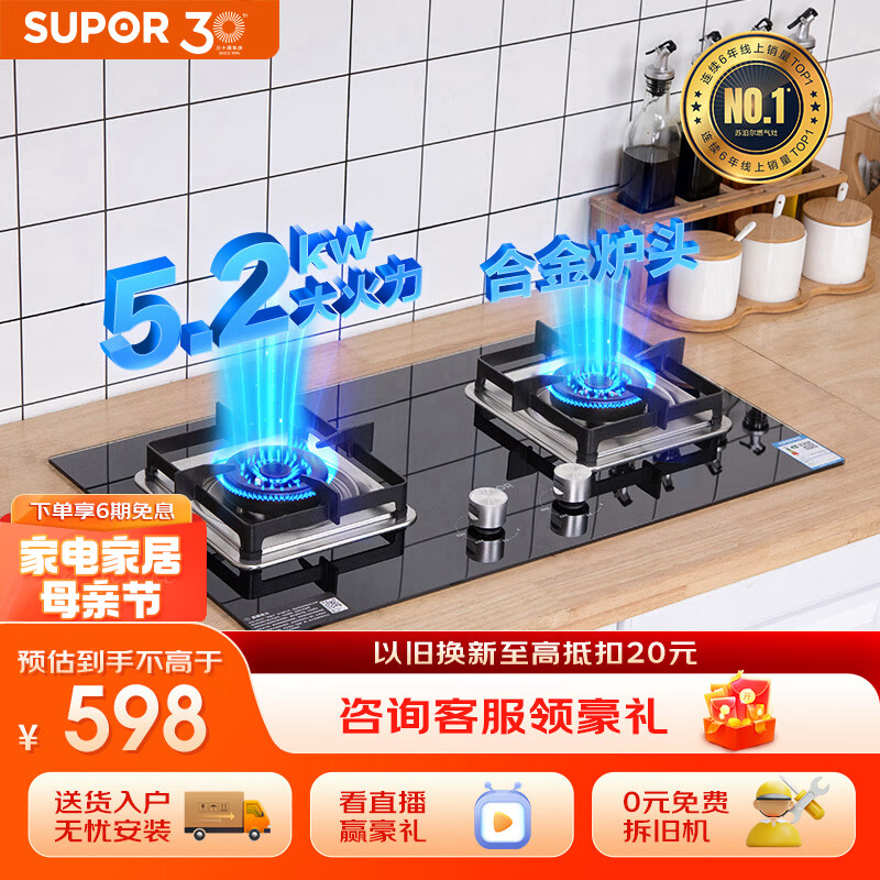 苏泊尔(SUPOR)家用燃气灶 双灶具5.2kW火力 63%热效率 宽域控火可拆卸炉头 聚能锅支架燃气灶具DB27液化气价格:598.00元!