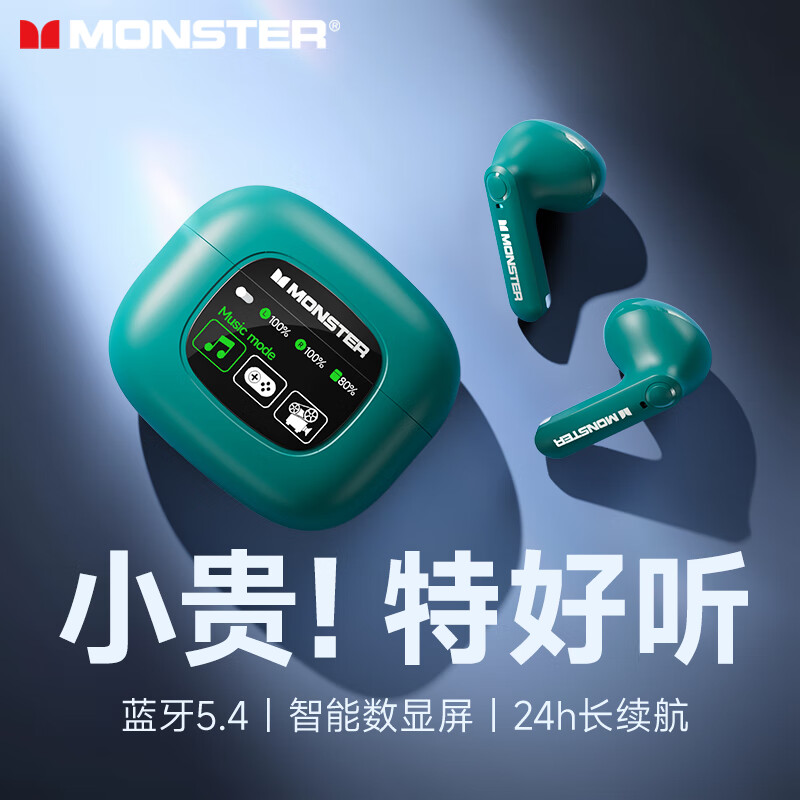 魔声(MONSTER)【柏林之声|智显屏】蓝牙耳机 无线半入耳式降噪通话高音质运动游戏长续航适用华为小米 XKT20绿色价格:199.00元!
