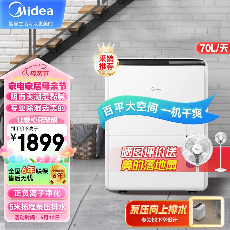 美的(Midea)除湿机/抽湿机 除湿量70升/天 正负离子净化 工厂仓库地下室泵压排水工业吸湿器CF70BD/N8-DL1价格:1899.00元!