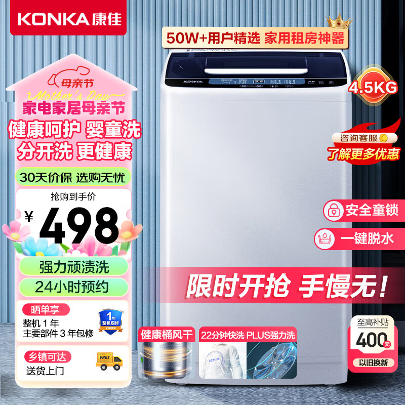 康佳(KONKA)波轮洗衣机全自动4.5公斤 迷你婴儿小型儿童内衣洗衣机小 22分钟快洗 XQB45-288价格:498.00元!