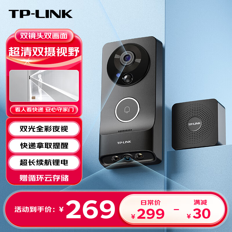 TP-link 双摄可视门铃智能电子猫眼双摄像头家用门口监控 智能门铃超清红外夜视无线wifi远程对讲 DB55C价格:269.00元!