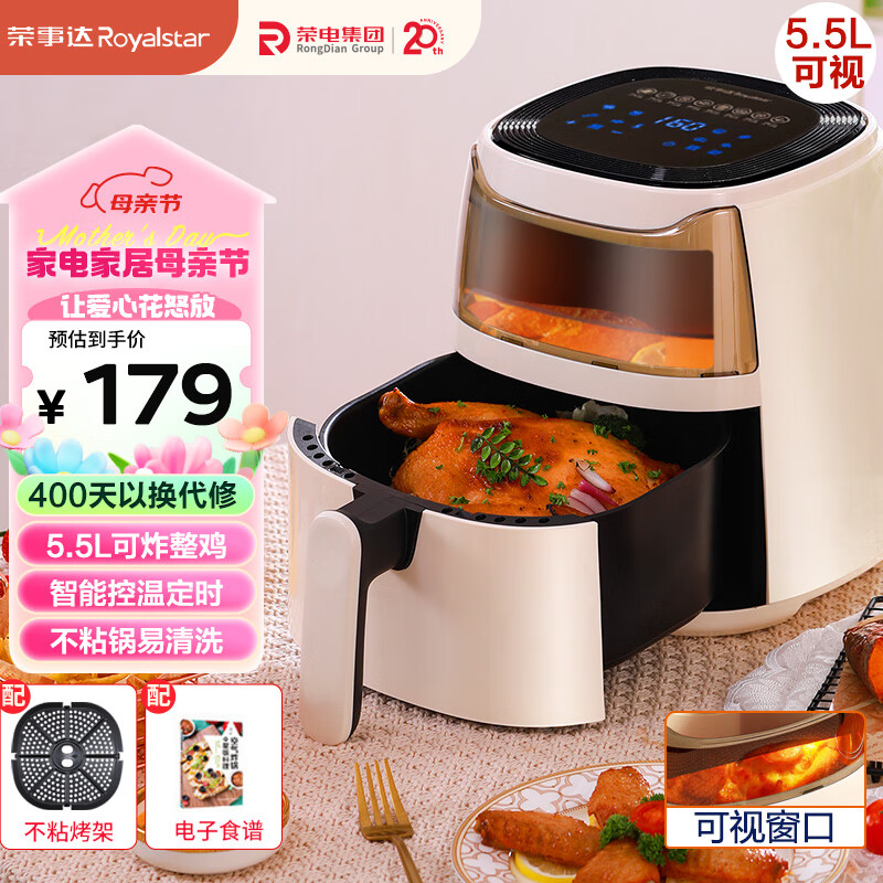 荣事达(Royalstar)空气炸锅5.5L家用大容量可视窗口微电脑大屏触控多功能无油烟微蒸嫩烤薯条机RS-AF1255D价格:179.00元!