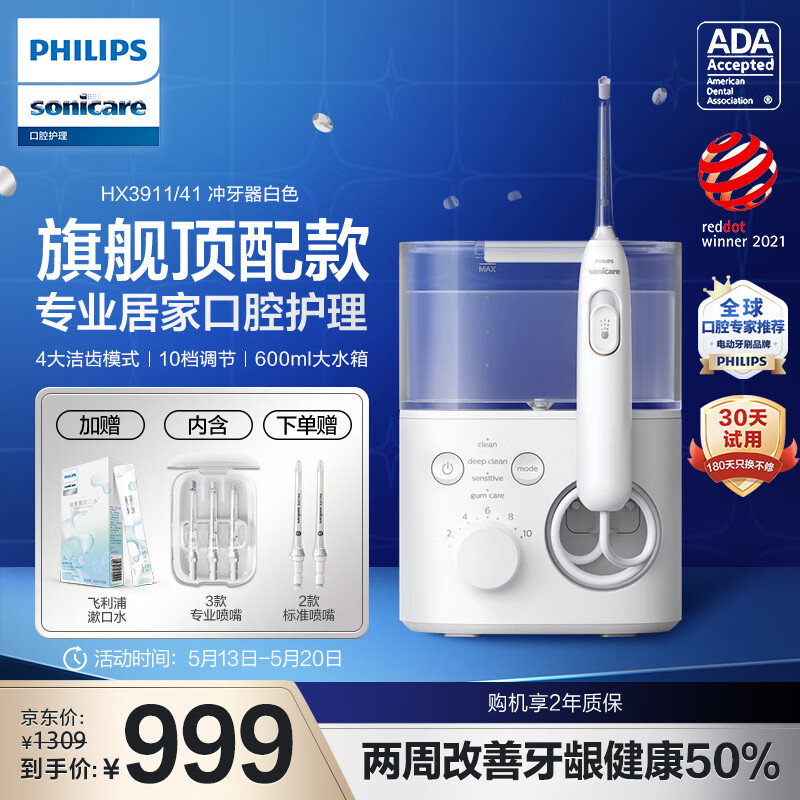 飞利浦(PHILIPS)家用台式冲牙器洗牙器台式家用四向水流科技4种洁齿模式 礼物水魔方白色HX3911/41价格:999.00元!