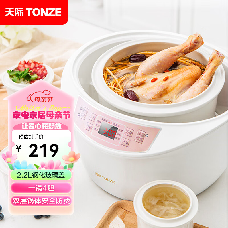 天际(TONZE)电炖锅 电炖盅 隔水炖锅 煲汤锅炖汤锅 婴儿辅食煮粥锅 养生燕窝炖盅 白瓷4胆 DGD22-W122B 2.2L价格:219.00元!