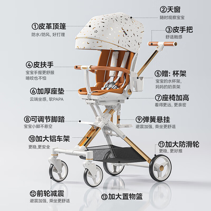 1、车子很稳当,减震不错,宝宝每次出门逛累了都在车上呼呼大睡也不颠簸。外观也好看,折叠方便。有点沉,但宝宝大了,沉一点更安心,不容易翻出来。