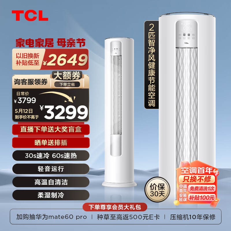 TCL空调 2匹 新三级能效 变频冷暖 智净风除菌 客厅空调立式 空调柜机KFR-51LW/JV2Ea+B3 以旧换新 价格:3299.00元!