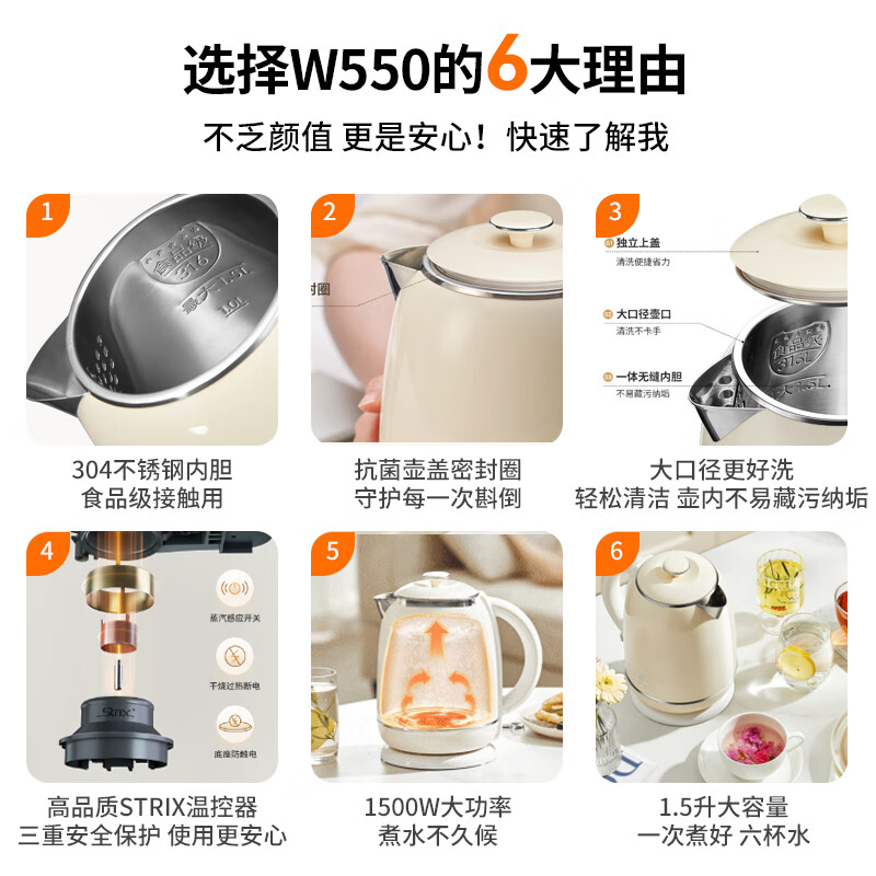 九阳(Joyoung)热水壶烧水壶电水壶1.5L 双层隔热304不锈钢无缝内胆 轻复古家用开水壶K15FD-W550价格:139.00元!