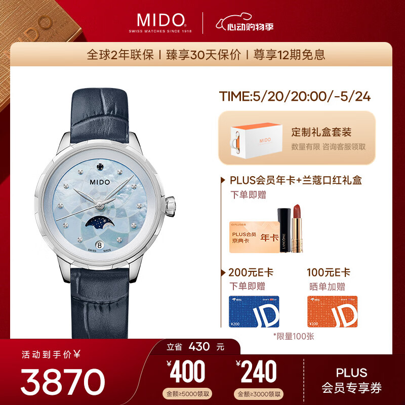 美度(MIDO)瑞士手表 花淅系列 月相款 水湖蓝 时尚优雅 石英皮带女表 送母亲价格:3870.00元!