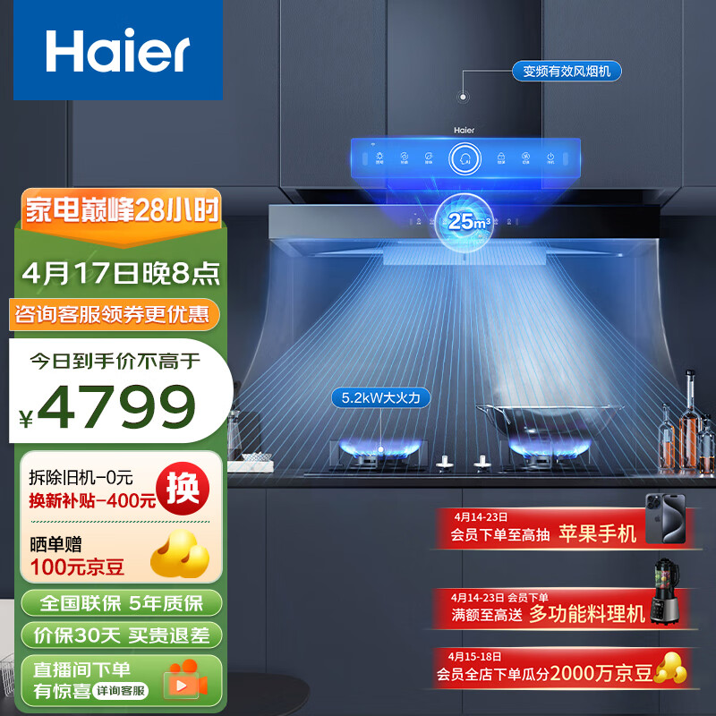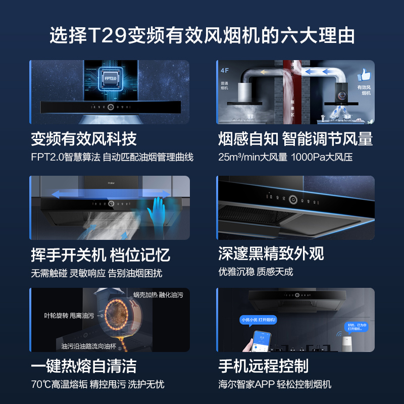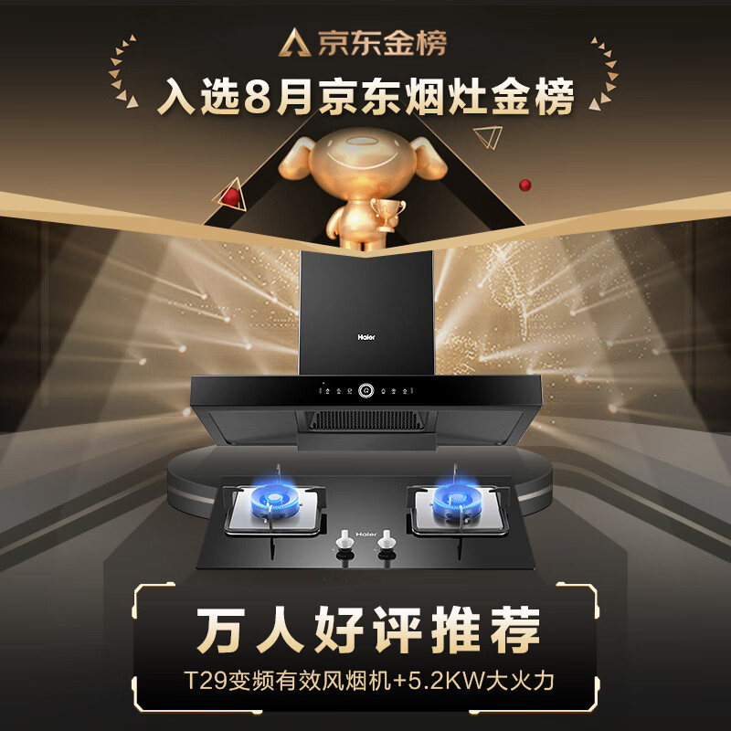 海尔(Haier)抽油烟机 烟灶套装 欧式家用 变频有效风 25立方1000pa挥手智控热熔洗5.2kw油烟机套装T29U1价格:4799.00元!