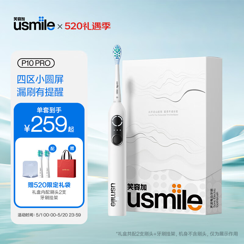 usmile笑容加电动牙刷 成人情侣款送男友/女友 全新四区识别可视化 P10 PRO冰河白 520情人节礼物价格:309.00元!