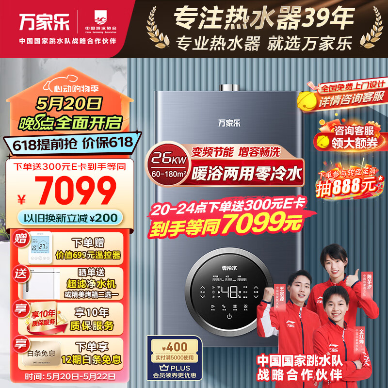万家乐双变频零冷水壁挂炉 洗浴采暖两用 燃气热水器 暖气片地暖 增容恒温30KW天然气R5L【100-230平】价格:8299.00元!