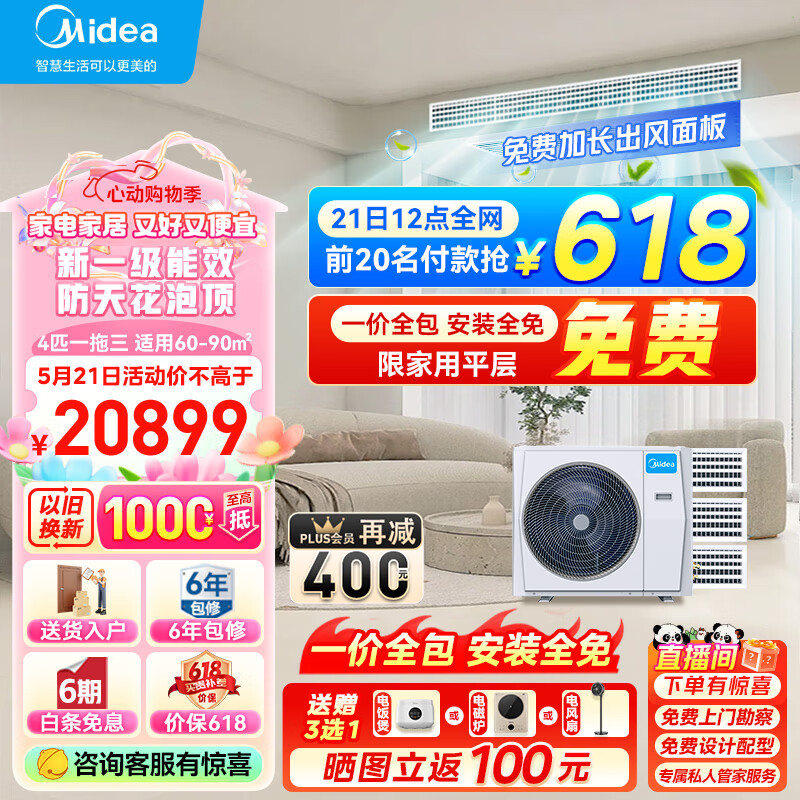 美的(Midea)中央空调一拖三风管机4匹多联机星光全直流变频新一级能效智能冷暖清洁嵌入式隐形嵌系列MDS三代价格:20999.00元!