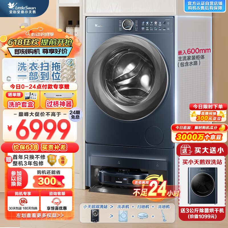 小天鹅(LittleSwan)【双洗站AIR】 洗衣扫拖一体 扫地机器人 滚筒洗衣机全自动 超薄全嵌10公斤 毛发切割 TG100RM9ILZ价格:6999.00元!