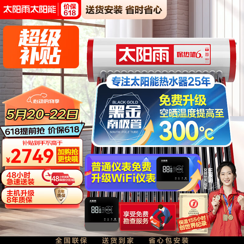 太阳雨(Sunrain)太阳能热水器 家用全自动上水 光电两用 一级能效 配智能仪表电加热155L保热墙6代20管价格:2749.00元!