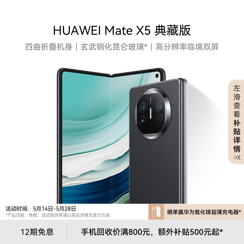 华为(HUAWEI) Mate X5 典藏版 折叠屏手机 16GB+1TB 羽砂黑价格:16999.00元!
