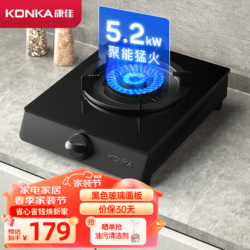 康佳(KONKA)燃气灶单眼灶具 5.2kW猛火台式免打孔天然气灶 家用黑色玻璃面板灶台 JZT-D526Y(天然气)价格:178.10元!