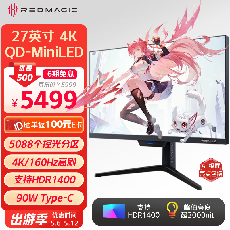 努比亚(nubia)红魔电竞显示器GM001S 27英寸 4K 160Hz MiniLED 5088分区 支持HDR1400 90W Type-C接口 高清液晶价格:5999.00元!