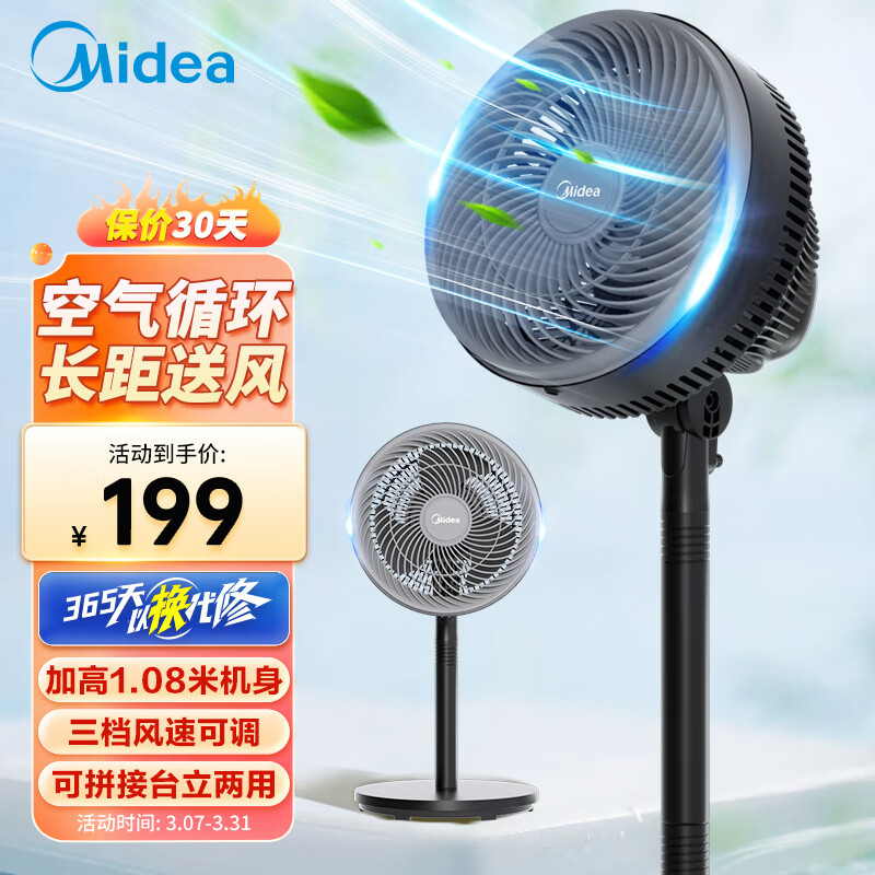 美的(Midea)电风扇 空气循环扇落地扇家用台式立式两用风扇卧室客厅轻音低噪节能电扇 FGA24UM【机身高度1.08米 台立两用】 循环空气风扇价格:219.00元!