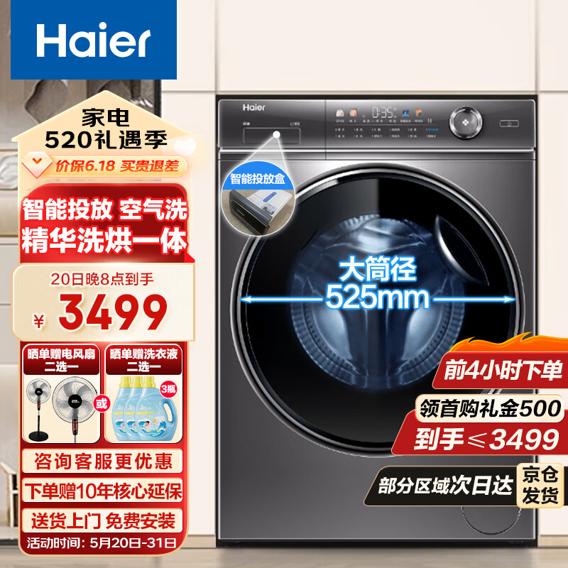 海尔(Haier)【精华洗】10KG滚筒洗衣机全自动大容量变频一级能效除菌螨智能投放+洗烘一体XQG100-HBD14326L价格:3999.00元!