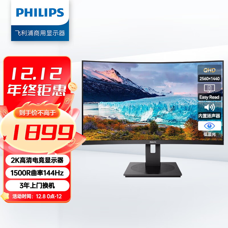 飞利浦 31.5英寸曲面显示器 2K高清 曲率1500R 144Hz刷新 122%sRGB色域 防撕裂技术 游戏电竞显示屏 325S1CAE价格:1899.00元!