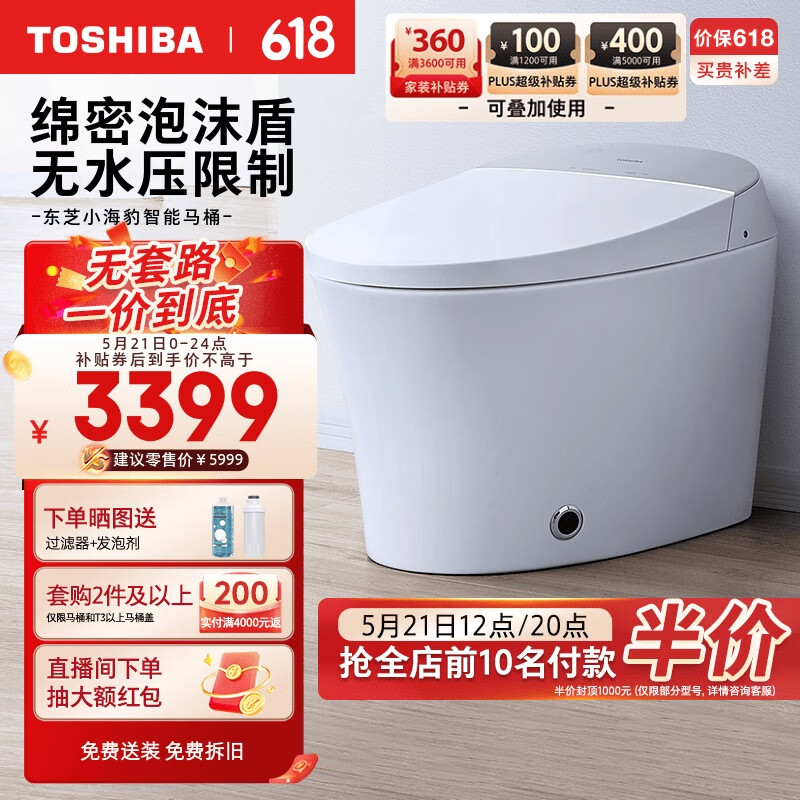 东芝(TOSHIBA)智能马桶一体机带水箱隔臭泡沫盾脚感冲水家用坐便器小海豹A500价格:4259.00元!