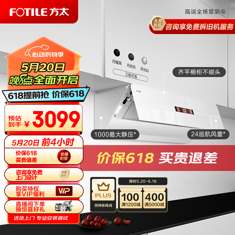 方太(FOTILE)抽吸油烟机 侧吸式家用厨房白色油烟机 24巡航风量 挥手智控 方太新月系列 月光白 01-F1-W价格:3399.00元!