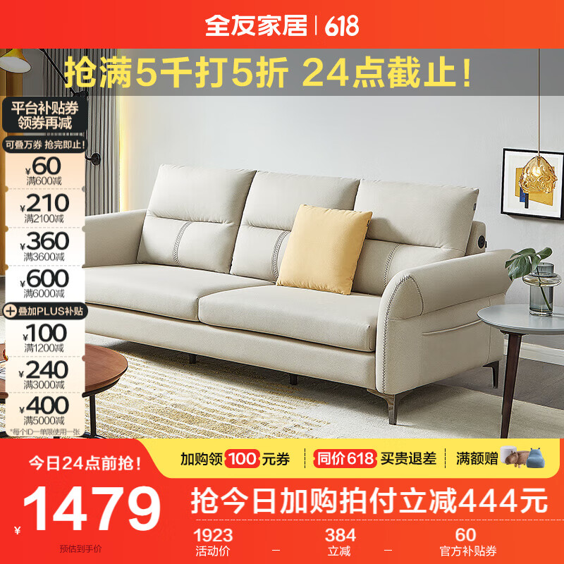 全友家居 现代简约功能科技布艺可拆洗储物三人位直排沙发客厅102679价格:1923.75元!