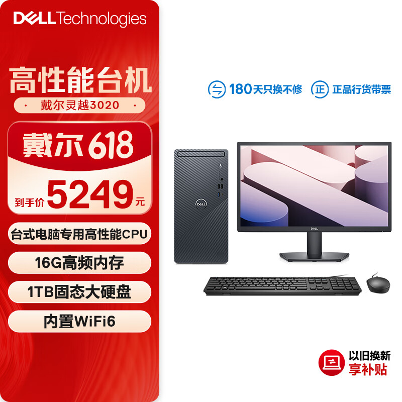 戴尔(DELL)灵越3020 台式电脑主机 (酷睿13代i5-13400 16G 1TBSSD)21.5英寸显示器 高性能CPU价格:5249.00元!