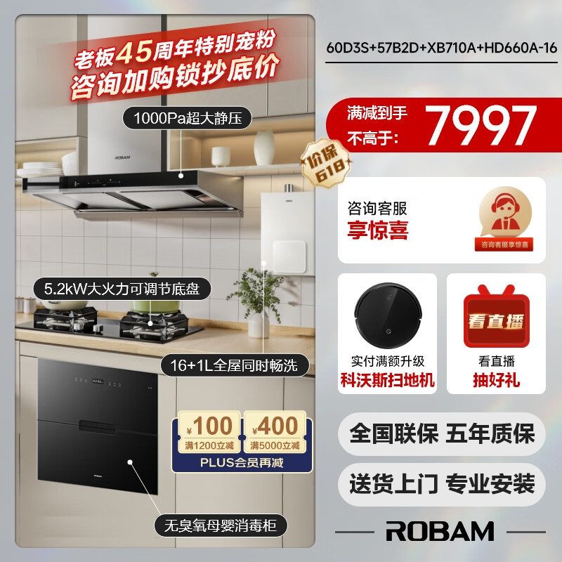 老板(Robam)抽油烟机厨房多件套欧式双腔变频24风量燃气灶燃气热水器消毒柜60D3S+57B2D+XB710A+HD660A-16价格:8997.00元!