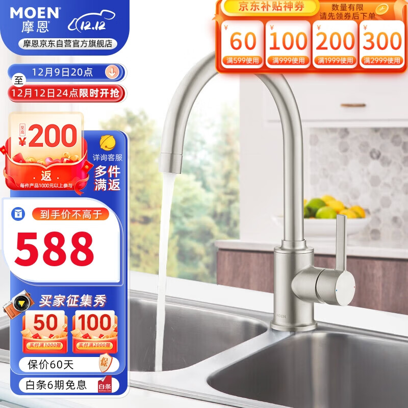 摩恩(MOEN)精防指纹厨房龙头 净铅高抛龙头 水槽洗菜盆洗碗盆冷热水龙头价格:688.00元!