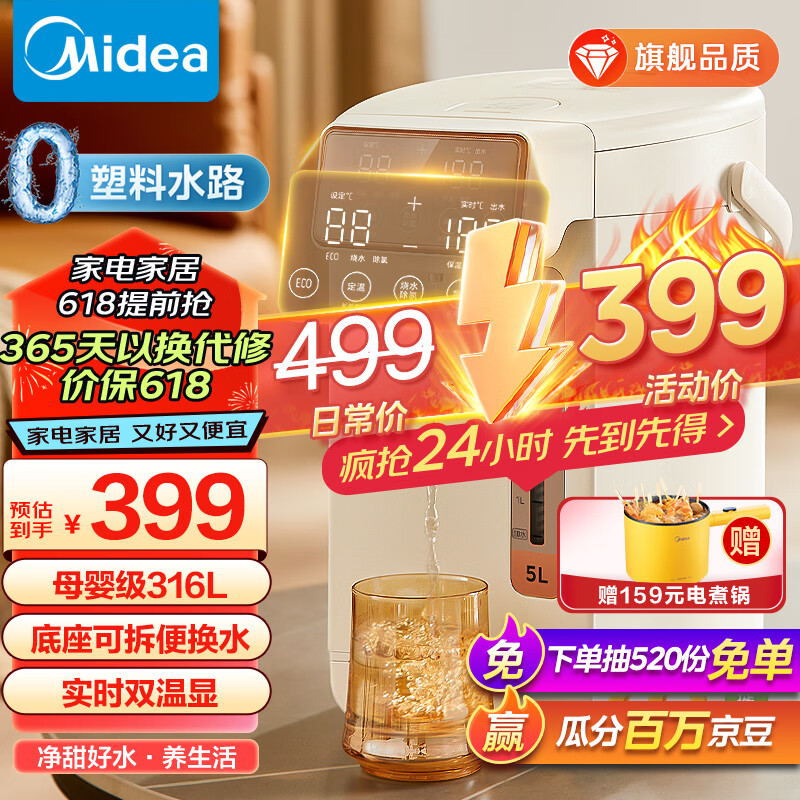 美的(Midea)0塑料水路电水瓶电热水瓶 电热水壶烧水壶 5L大容量316L不锈钢 保温恒温家用电水壶开水壶10FPro价格:449.00元!