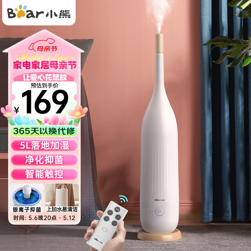 小熊(Bear)加湿器卧室轻音婴儿 办公室客厅迷你空气加湿器大雾量 低噪香薰机 落地上加水 5升巨量 JSQ-E50T1价格:169.00元!