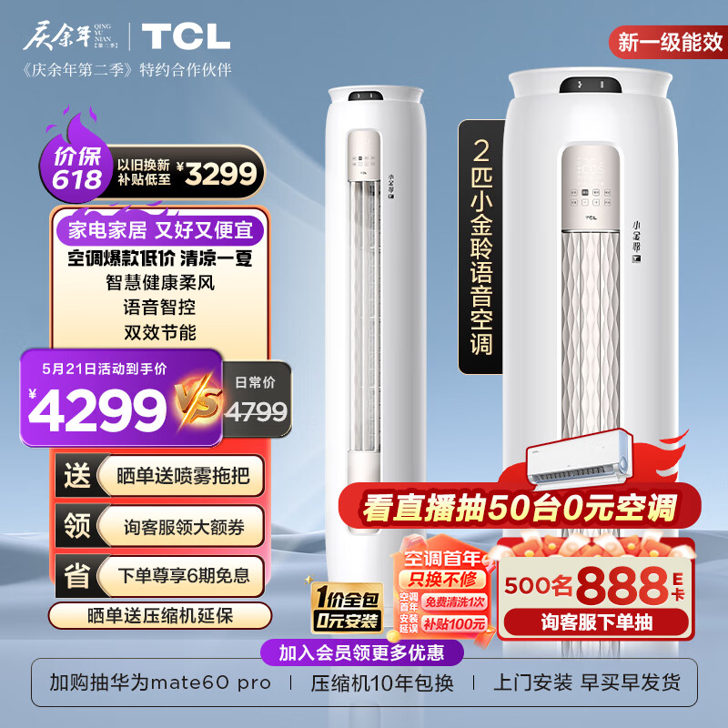 TCL空调2匹新一级能效变频冷暖 小金聆 语音智能 空调立式 空调柜机KFR-51LW/RT7Ga+B1一价全包价格:4299.00元!