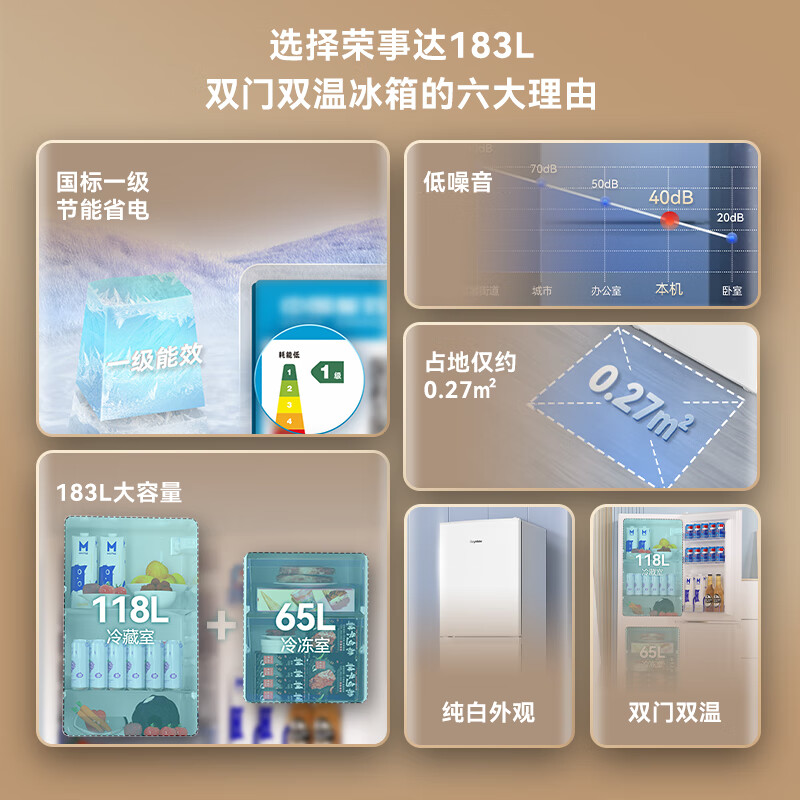 荣事达(Royalstar)183升小冰箱小型家用出租房办公室宿舍双开门两门双门二门电冰箱节能省电低音白色BCD-183L9RSZ价格:729.00元!