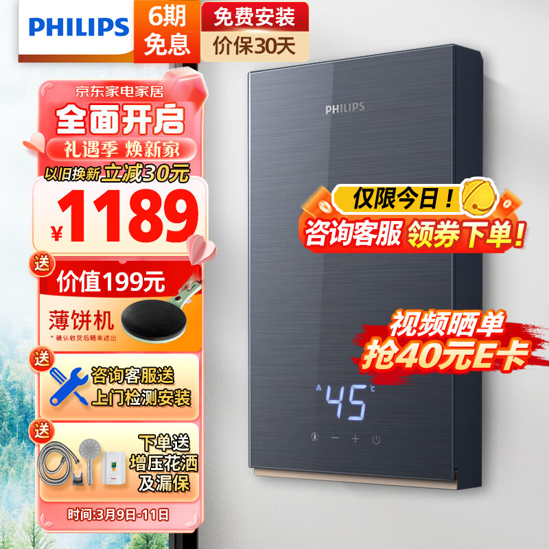 飞利浦即热式电热水器 7000W速热无极变频Ai四季恒温免储水 淋浴洗澡水电分离AWH1046/93上门安装价格:1199.00元!
