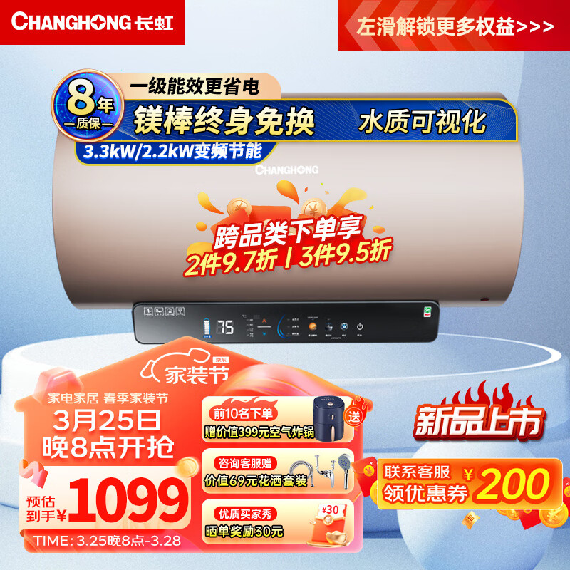 长虹(CHANGHONG)终身免换镁棒电热水器80升家用储水式3300W速热一级能效变频节能自动断电Y80RD7价格:1199.00元!