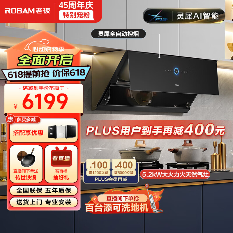 老板(Robam)【灵犀烟灶联动升级】侧吸油烟机26风量变频抽油烟机家用燃气灶具烟灶套装29A9S+57B6D(天然气)价格:7199.00元!