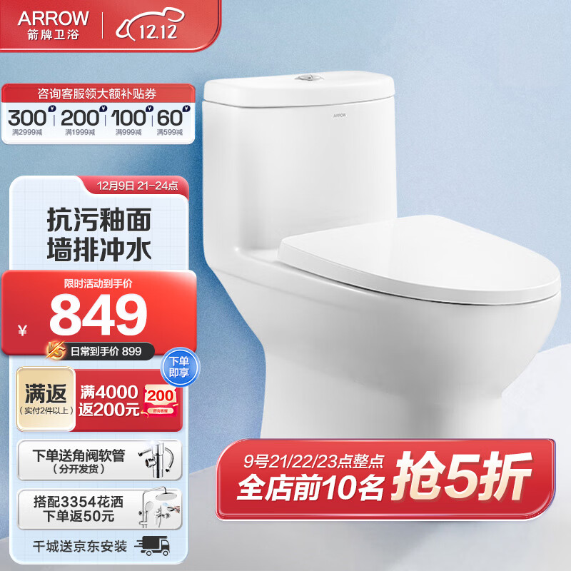 箭牌(ARROW)抽水马桶家用直冲坐便器小尺寸普通座便 小户型坐厕墙排式AE1126H价格:1149.00元!