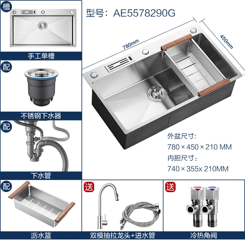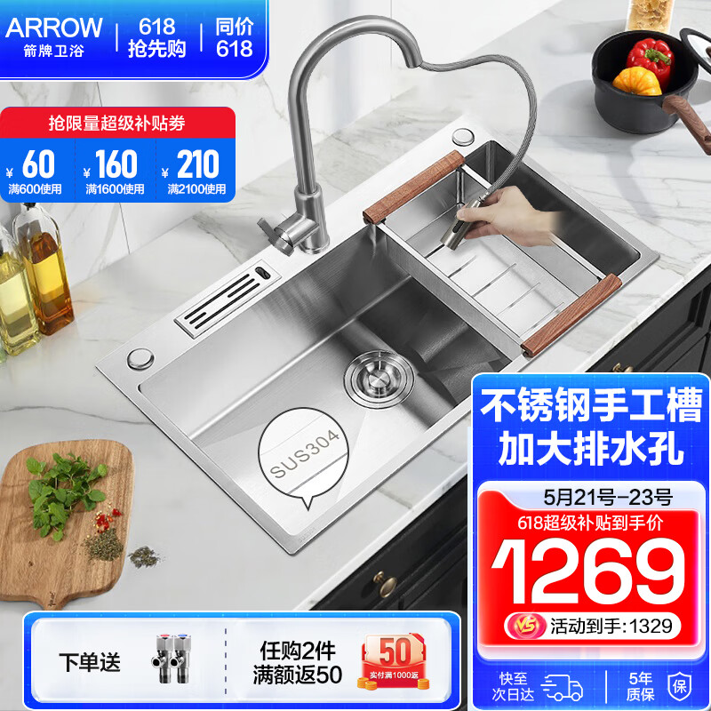 箭牌(ARROW) 304不锈钢加厚手工水槽大单槽厨房水槽洗菜盆一体盆大单槽 78*45手工槽(含沥水篮+龙头)价格:1527.00元!