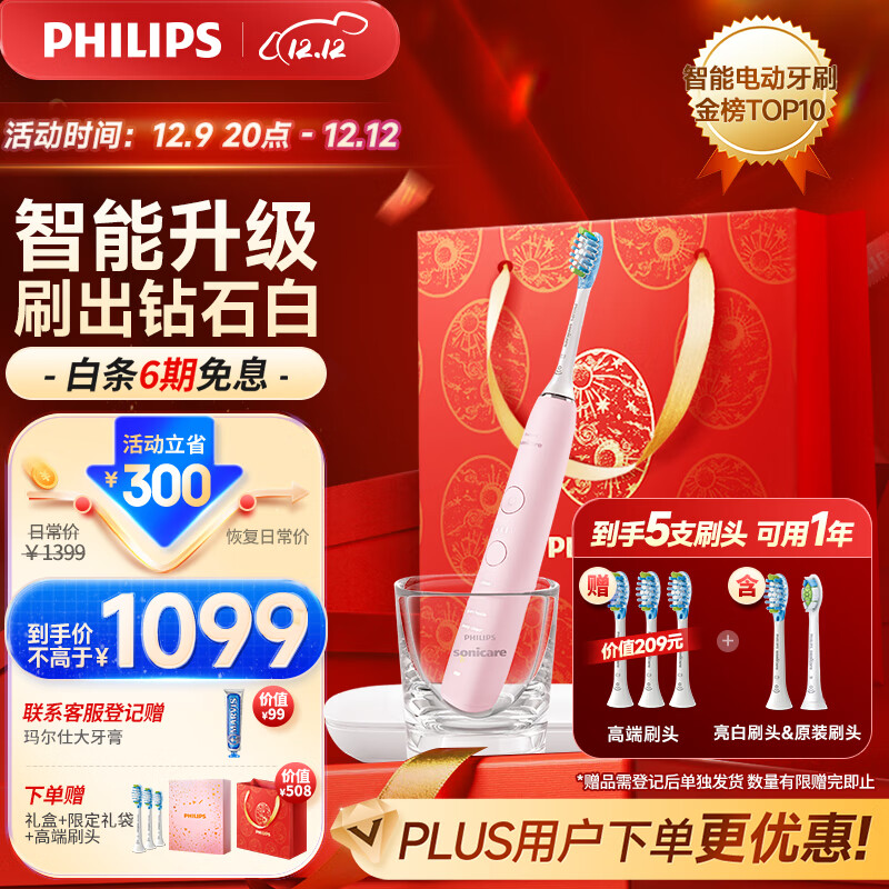 飞利浦(PHILIPS)智能声波震动电动牙刷 生日礼物送女友 钻石刷Pro升级款 12种洁齿模式 粉色HX9912/40价格:1299.00元!